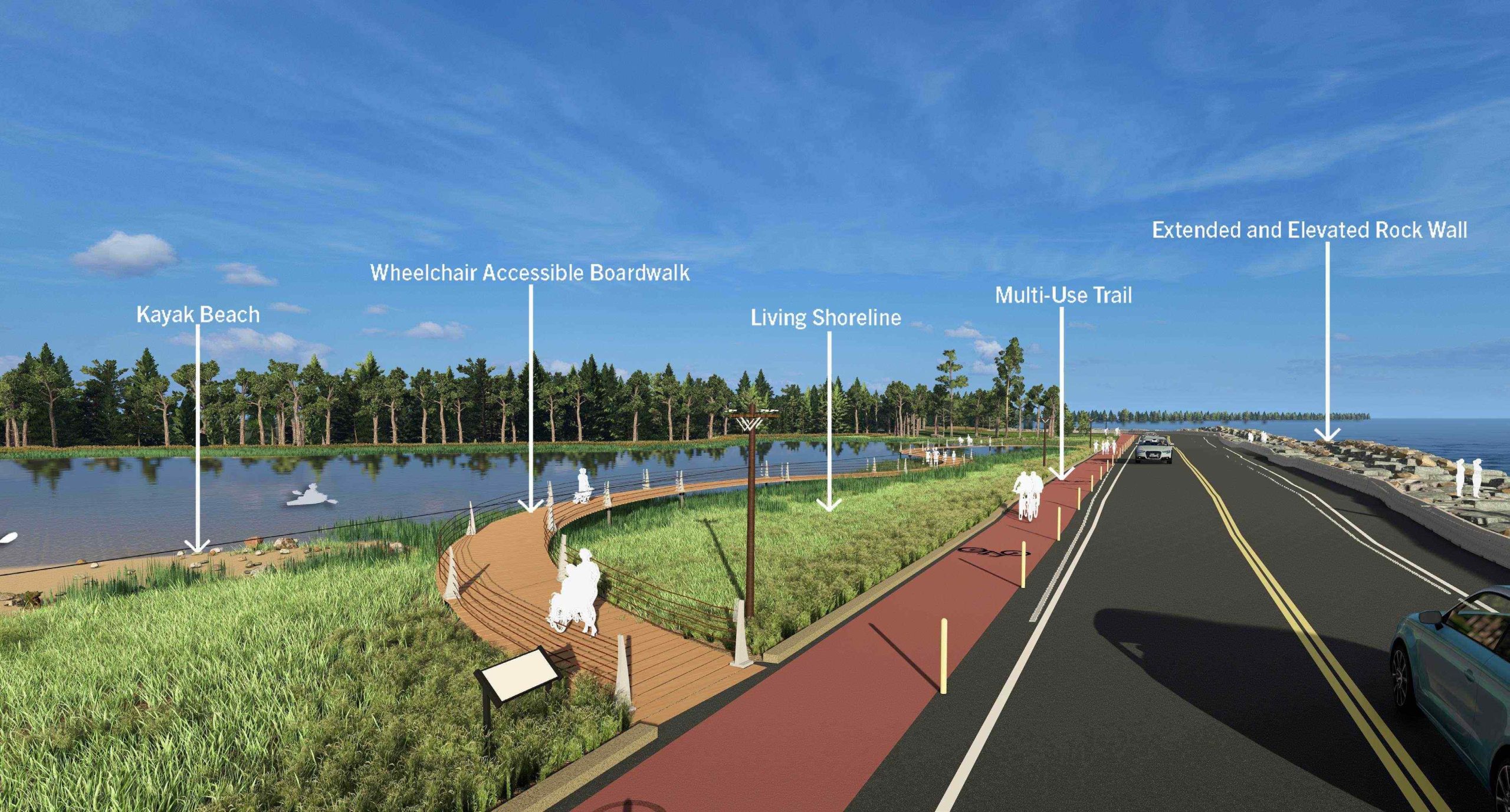The student groups looked at a range of solutions which both protected the park land while also offering new opportunities for recreation. Raised walkways crossed areas where wetland buffers allowed for marsh migration, and kayak trails pass by living shorelines and floating wetlands. Boardwalks contain educational panels about the helical piers that are adjustable for rising waters and oyster reefs in Lake Conoy serve as living breakwaters to protect the marsh.