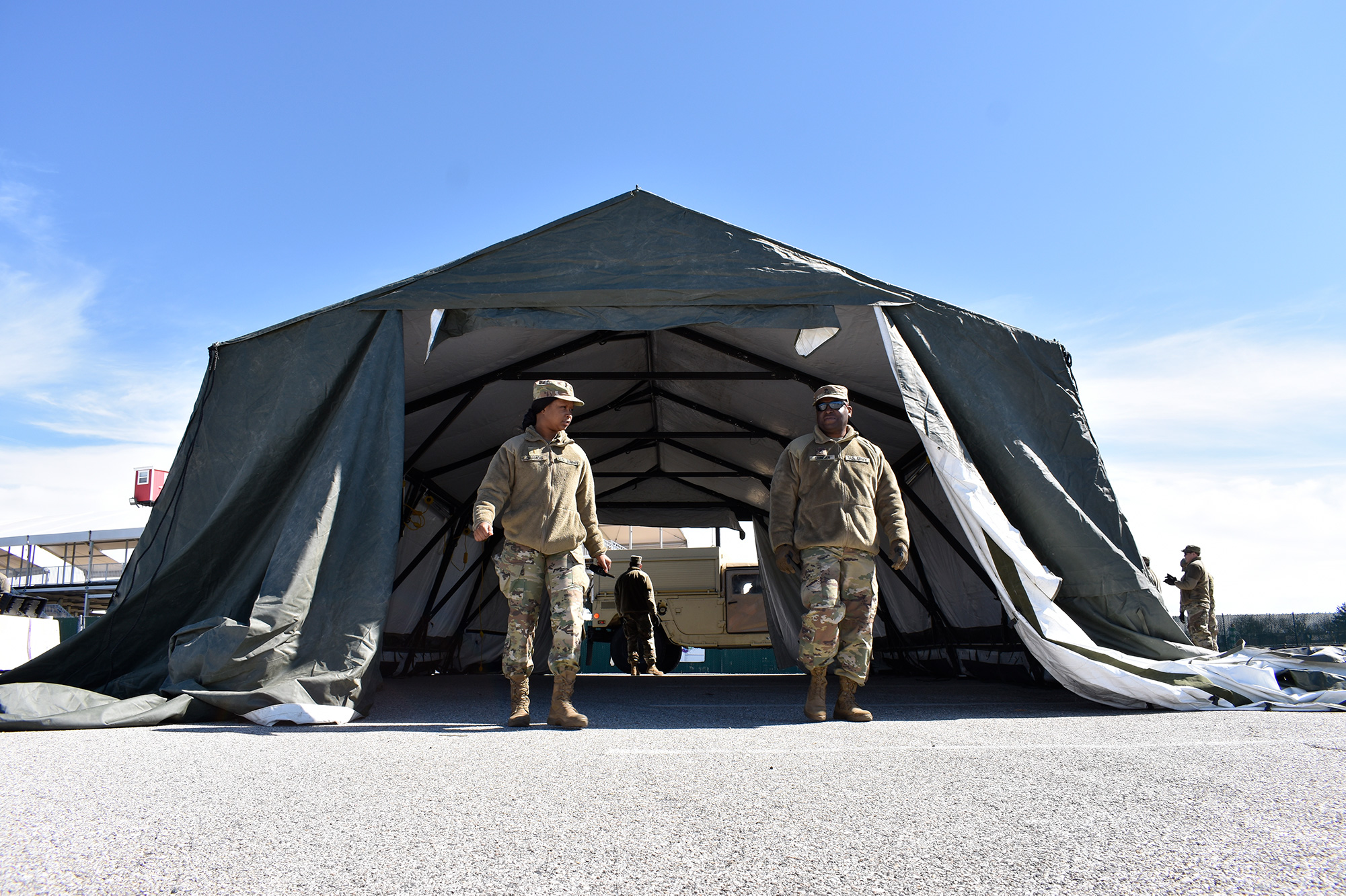 Service Members of the Maryland Army National Guard’s 1297th Combat Sustainment Support Battalion and 1729th Maintenance Company, both based in Havre de Grace, Maryland, and the 1229th Transportation Company, based in Baltimore, Maryland, erected Deployable Rapid Assembly Shelters and medium tents in the parking lot outside the race course.