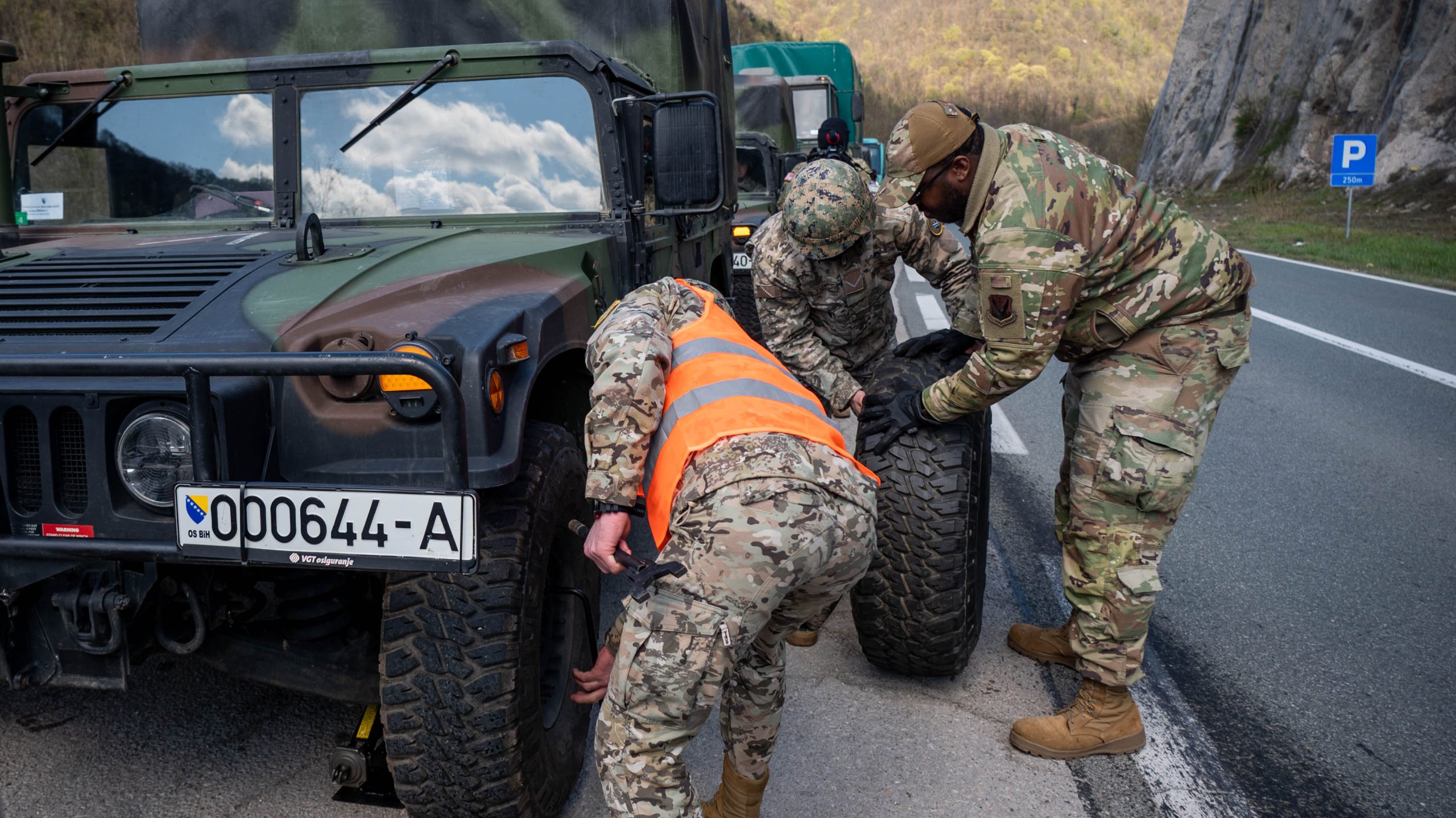The partnership engagement concluded with a convoy operation, during which the AFBiH and Maryland National Guard members practiced multi-vehicle operations from Zenica to Visoko with maintenance injects including engine repairs and changing a tire on the side of the road.