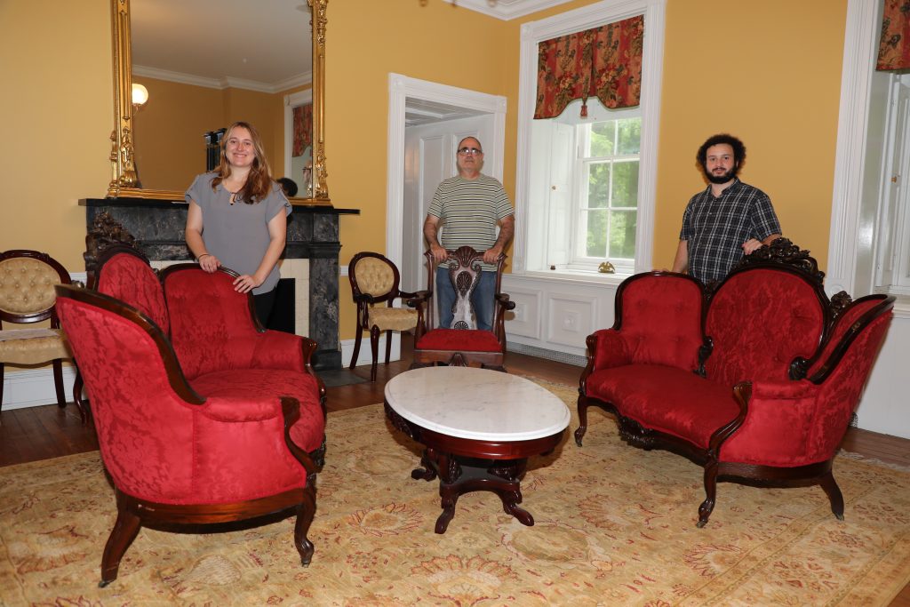 Maryland Military Department’s Alexandra Reed, archivist trainee, left, Richard Morain, museum volunteer, middle, and Parker Reilly, archivist trainee, all with the Maryland Museum of Military History, pose for a photo with curated furniture from an anonymous donor at the Montrose Mansion at Camp Fretterd Military Reservation in Reisterstown, Maryland, on June 6, 2025. Over 40 items varying in historical value were curated, ranging from furniture, dinnerware and cutlery, art, music sheets, and more. (Photo by Chazz Kibler)