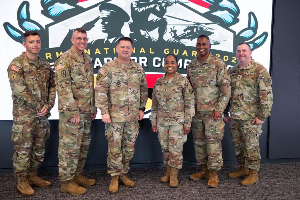 Gen. Steven Nordhaus, chief of the National Guard Bureau, Senior Enlisted Advisor John Raines III, SEA to the chief of the National Guard Bureau, Maj. Gen. Janeen Birckhead, the Adjutant General of Maryland and Command Sgt. Maj. David C. Harry, senior enlisted leader of the Maryland Army National Guard, pose for a photo with competitors in the Army National Guard’s 2025 Best Warrior Competition on July 12, 2025, at Under Armour Headquarters in Baltimore, Maryland. (U.S. Army National Guard photo by Staff Sgt. Kimberley Glazier)
